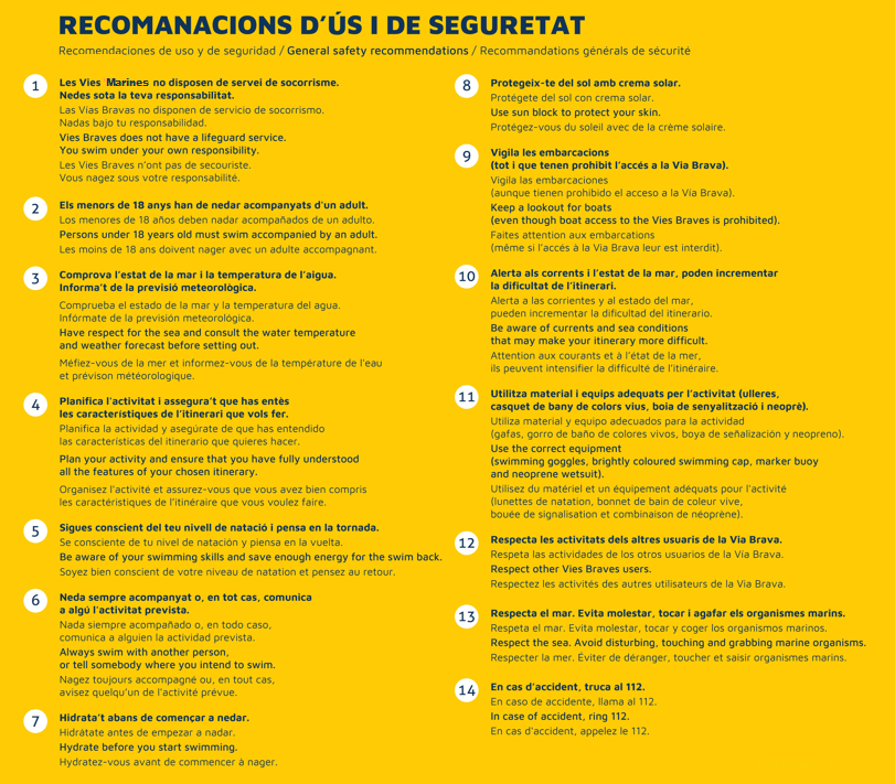 Recommandations générales de sécurité: utilisez du matériel et un équipement adéquats pour l'activité (lunettes de natation, bonnet de pain de coleur vive, boubée de signalisation et combinaison de néoprène). Consultez ici toutes les recommandations générales de sécurité.